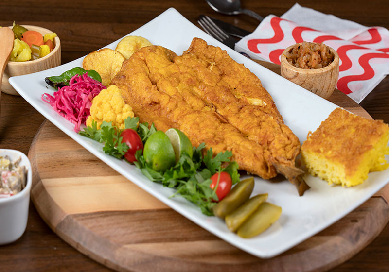Shourideh Fish dipped in beignet Batter decorated with Peanut Chips, Garnish