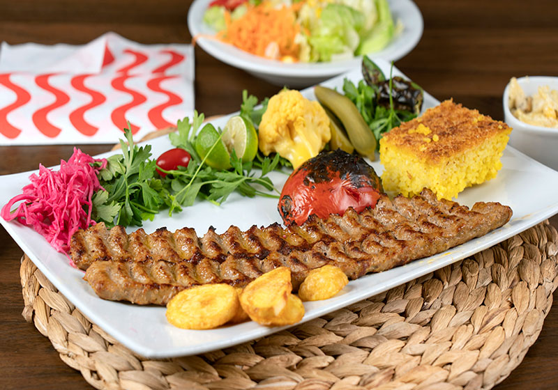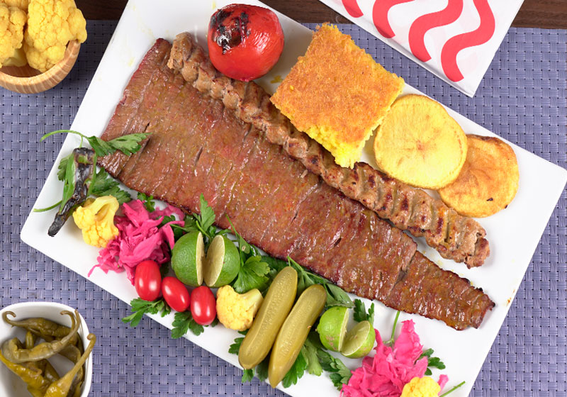 یک سیخ کباب برگ مخصوص 220گرم و یک سیخ کباب کوبیده 240گرم و دورچین